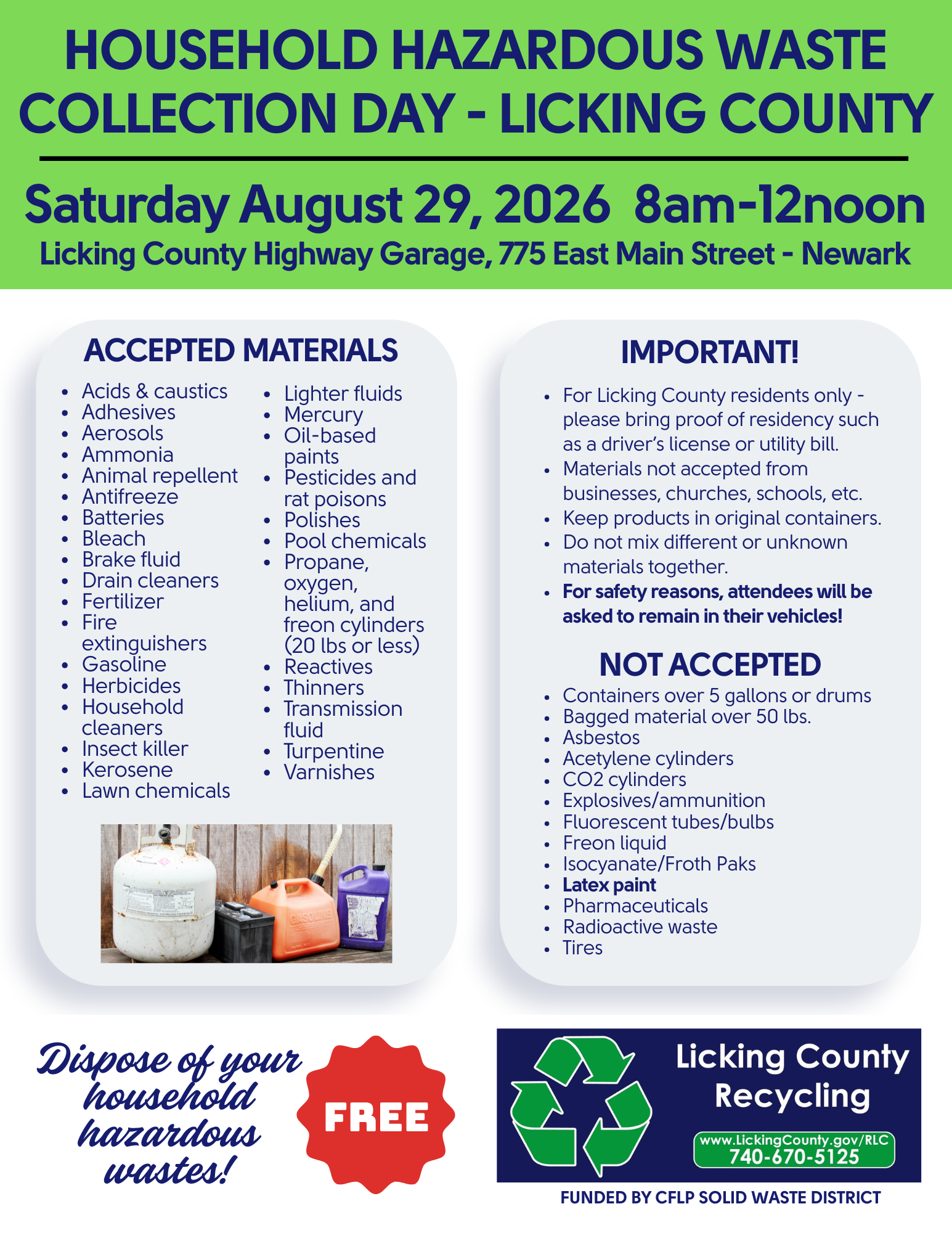 We are financially supported by the CFLP Solid Waste District (Coshocton, Fairfield, Licking, and Perry) and the Licking County Commissioners. Funding for solid waste districts throughout Ohio comes from waste disposal fees paid by waste haulers when they dispose of waste at landfills in the state. That money is then distributed to counties for recycling promotion.